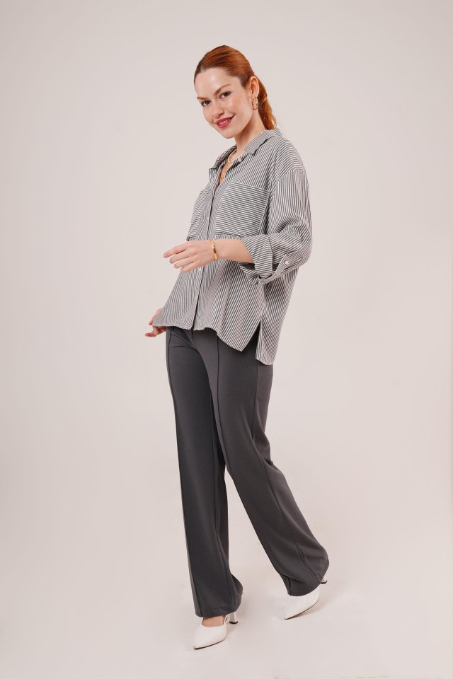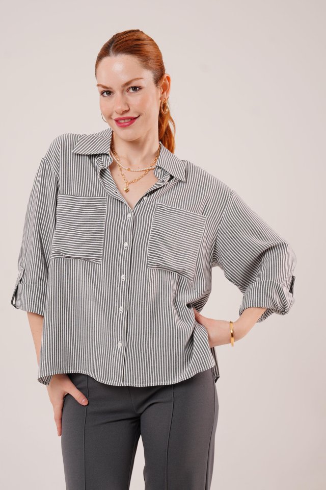 Yarasa Kol Çizgili Cep Detaylı Gri Gömlek