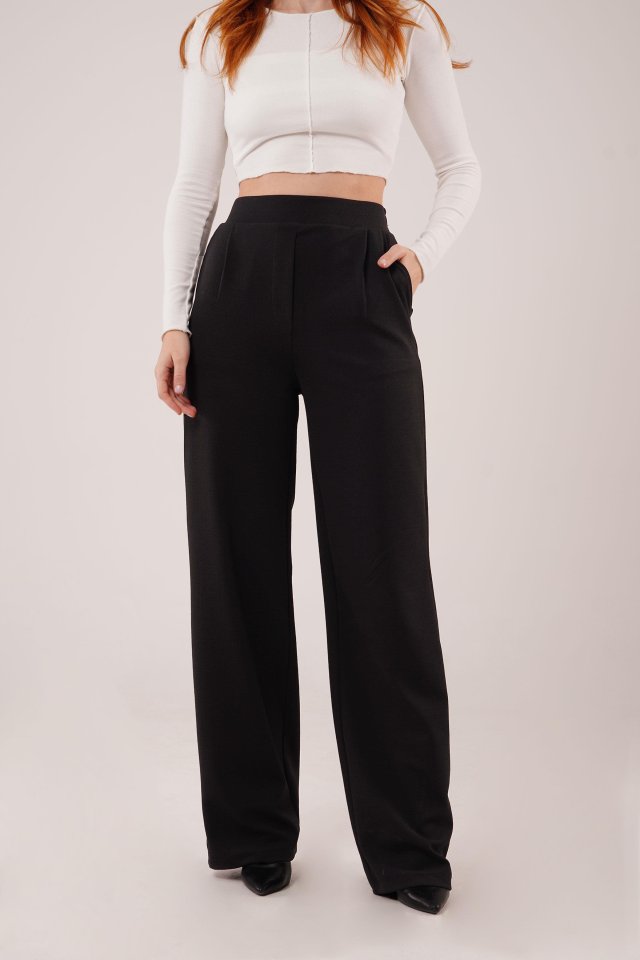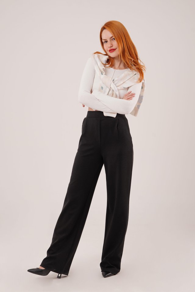 Yüksek Bel Bol Paça Krep Siyah Pantolon