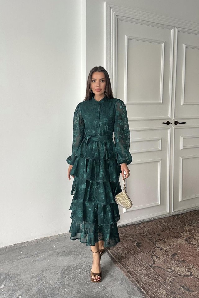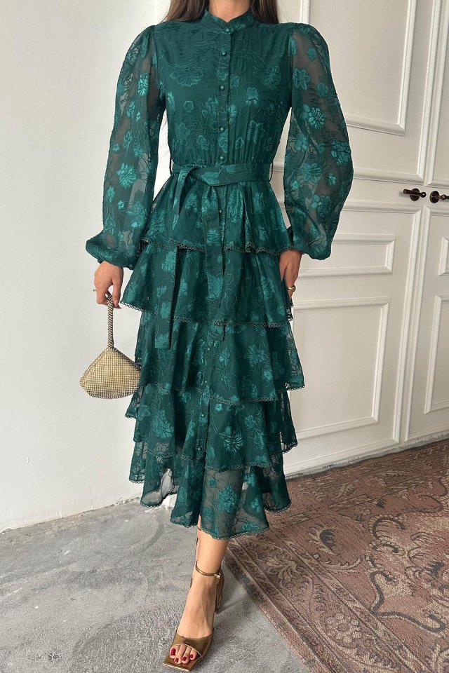 Zümrüt Valonlu Şeritli Kat Kat Elbise