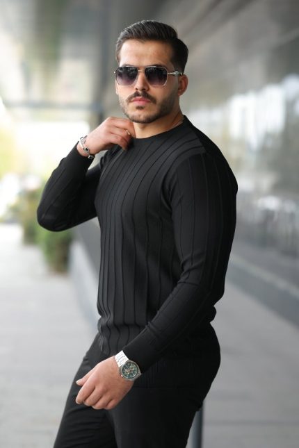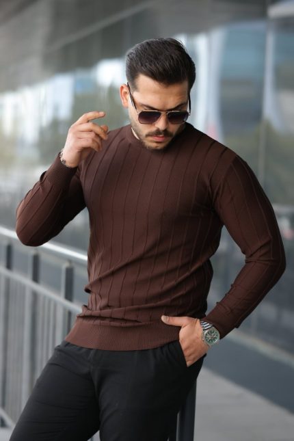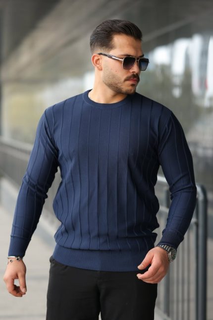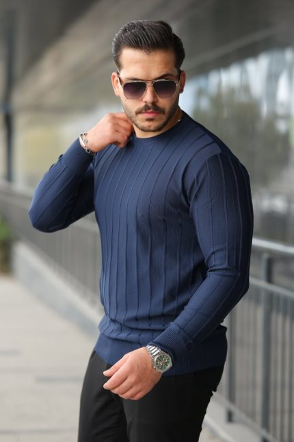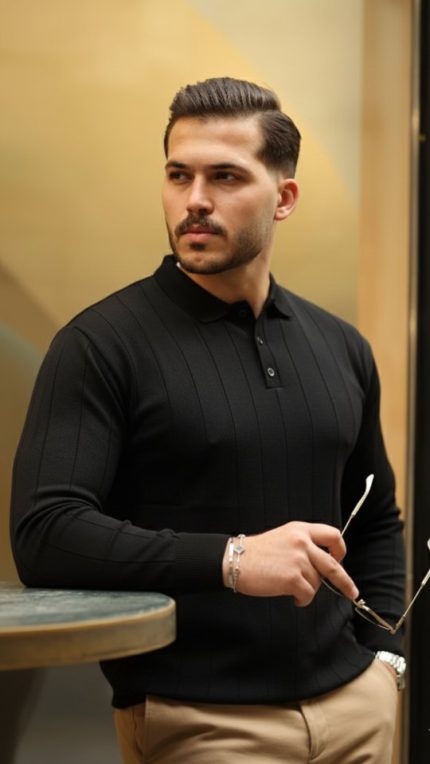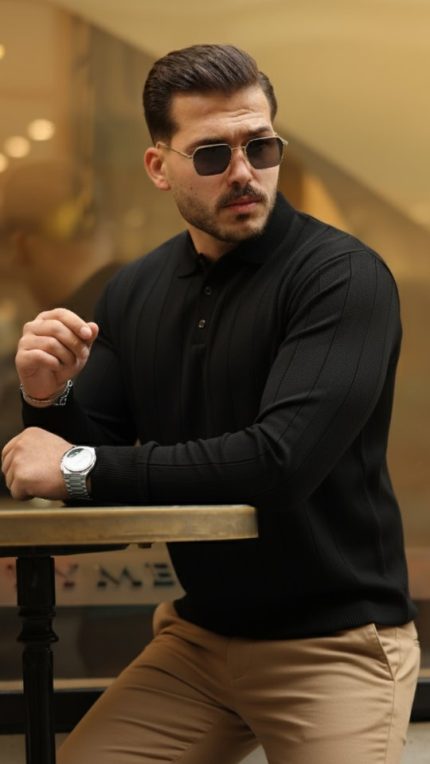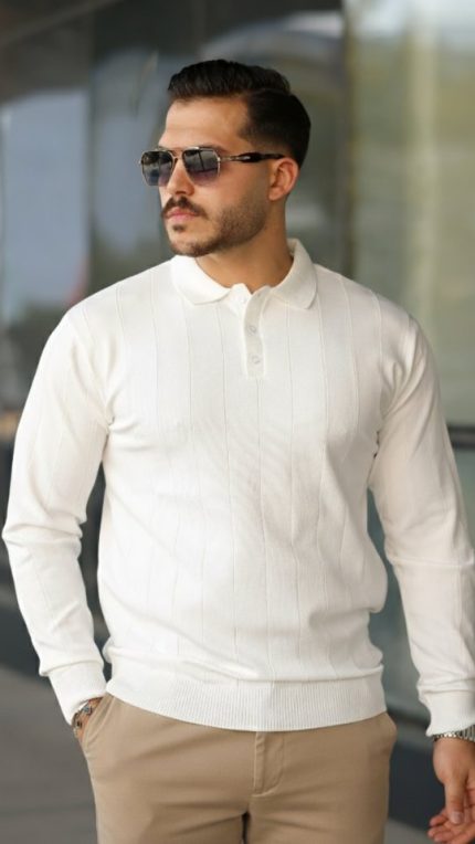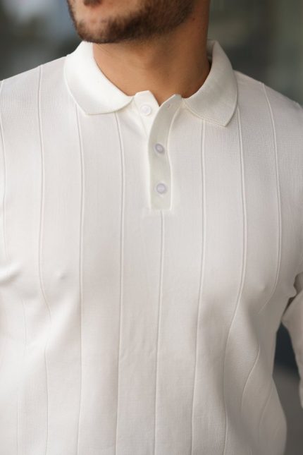 Erkek Düğmeli Yaka çizgi Dokulu Uzun Kollu Triko