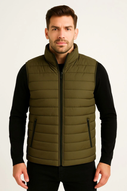Erkek Şişme Fermuarlı Yelek Su Itici Kapitone Astarlı Kumaş Cepli Hafif Kışlık Spor Rahat Kalıp – Haki