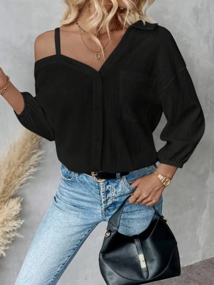 Orijinal fiyat: ₺334,13.₺300,71Şu andaki fiyat: ₺300,71.Kadın Tek Omuzdan Açık Askılı Uzun Kollu Yakalı önden Düğmeli Gömlek