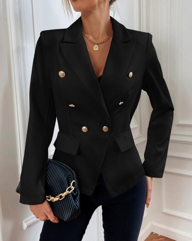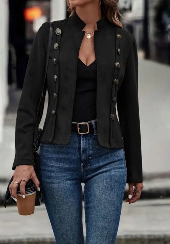 Kadın Uzun Kollu Hakim Yaka Düğme Detaylı Mini Dokuma Ceket
