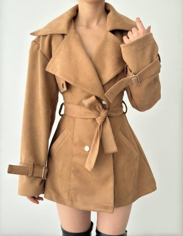 Kadın Uzun Kollu Yakalı Düğmeli Süet Mini Manto